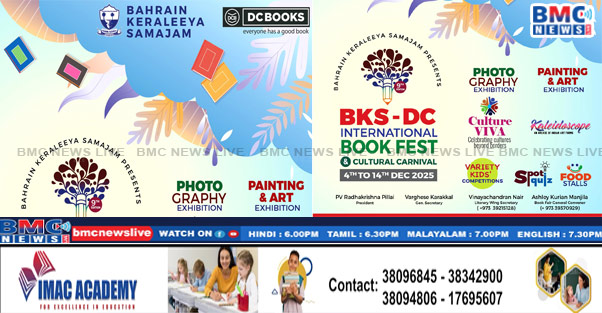 ബഹ്റൈൻ കേരളീയ സമാജവും ഇന്ത്യയിലെ പ്രമുഖ പ്രസാധകരുമായ ഡിസി ബുക്സും സംയുക്തമായി സംഘടിപ്പിക്കുന്ന ഒൻപതാമത് ബി. കെ. എസ്. – ഡി. സി. അന്താരാഷ്ട്ര പുസ്തകോത്സവവും കൾച്ചറൽ കാർണിവലും ഡിസംബർ 4 മുതൽ 14 വരെ ബഹ്റൈൻ കേരളീയ സമാജത്തിൽ വച്ച് നടക്കുമെന്ന് സമാജം പ്രസിഡന്റ് പി വി രാധാകൃഷ്ണപിള്ള ജനറൽ സെക്രട്ടറി വർഗീസ് കാരക്കൽ എന്നിവർ പത്രകുറിപ്പുലൂടെ അറിയിച്ചു. കേരളത്തിലെ പ്രമുഖ എഴുത്തുകാരുടെയും സെലിബ്രിറ്റികളും സാന്നിധ്യം പ്രതീക്ഷിക്കുന്ന പുസ്തകമേളയിൽ ബഹ്റൈനിലെ ഏഴോളം മലയാളി എഴുത്തുകാരുടെ പുസ്തകങ്ങളും […]