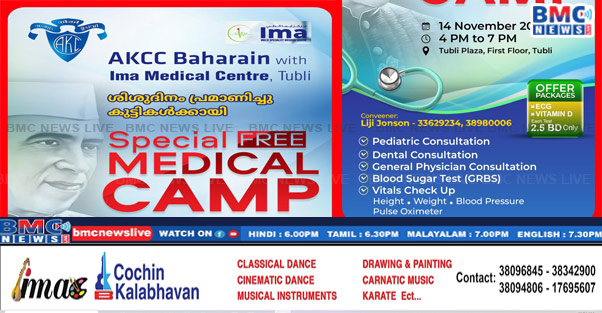 ജവഹർലാൽ നെഹ്റുവിന്റെ ജന്മദിനമായ നവംബർ 14ന് വെള്ളിയാഴ്ച, ശിശുദിനത്തിൽ വൈകിട്ട് 4.pm ന് ബഹ്റൈൻ എ. കെ. സി.സി. ഇമാ മെഡിക്കൽസുമായി സഹകരിച്ച് കുട്ടികൾക്കായി സൗജന്യ മെഡിക്കൽ ക്യാമ്പ് സംഘടിപ്പിക്കുന്നു.ശിശുരോഗ വിദഗ്ധന്മാരും, ദന്തരോഗ വിദഗ്ധരും, സൗജന്യമായി കുട്ടികളെ പരിശോധിക്കും. വിവിധ പോഷക ആരോഗ്യപ്രശ്നങ്ങൾ കുട്ടികളുമായി ആശയവിനിമയം നടത്തുന്നതോടൊപ്പം, ആവശ്യമായ കുട്ടികൾക്ക് നിരവധി പരിശോധനകൾ സൗജന്യമായിരിക്കും.