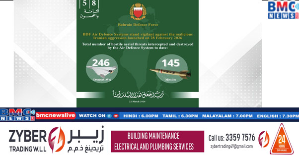 ബഹ്റൈനു നേരെ ഇറാൻ നടത്തുന്ന ആക്രമണത്തിന്റെ ഭാഗമായുള്ള മിസൈലുകളെയും ഡ്രോണുകളും , BDF ന്റെ വ്യോമ പ്രതിരോധ സംവിധാനങ്ങൾ വിജയകരമായി നേരിടുന്നുണ്ടെന്ന് ബഹ്റൈൻ പ്രതിരോധ സേനയുടെ ജനറൽ കമാൻഡ് അറിയിച്ചു. ഇതുവരെ ബഹ്റൈനെ ലക്ഷ്യമിട്ട് പതിച്ച 145 മിസൈലുകളും 246 ഡ്രോണുകളും നശിപ്പിച്ചതായും സേന വ്യക്തമാക്കി.BDF ഉദ്യോഗസ്ഥരുടെ സേവനത്തിലും നേതൃത്വത്തിലും ജനറൽ കമാൻഡ് അഭിമാനം പ്രകടിപ്പിക്കുകയും രാജ്യത്തെ പ്രതിരോധിക്കുന്നതിൽ അവരുടെ സുസ്ഥിരമായ പ്രവർത്തനത്തെ അഭിനന്ദിക്കുകയും ചെയ്തു.എല്ലാ പൊതുജനങ്ങളും അവരുടെ സ്വകാര്യ സുരക്ഷയ്ക്കായി പരമാവധി ജാഗ്രത പാലിക്കണമെന്ന് ജനറൽ കമാൻഡ് അഭ്യർത്ഥിച്ചു.