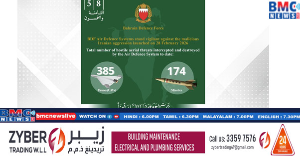 ബഹ്റൈനു നേരെ ഇറാൻ നടത്തുന്ന ആക്രമണത്തിന്റെ ഭാഗമായുള്ള മിസൈലുകളെയും ഡ്രോണുകളും , BDF ന്റെ വ്യോമ പ്രതിരോധ സംവിധാനങ്ങൾ വിജയകരമായി നേരിടുന്നുണ്ടെന്ന് ബഹ്‌റൈൻ പ്രതിരോധ സേനയുടെ ജനറൽ കമാൻഡ് അറിയിച്ചു. ഇതുവരെ ബഹ്‌റൈനെ ലക്ഷ്യമിട്ട് പതിച്ച 174 മിസൈലുകളും 385 ഡ്രോണുകളും നശിപ്പിച്ചതായും സേന വ്യക്തമാക്കി.BDF ഉദ്യോഗസ്ഥരുടെ സേവനത്തിലും നേതൃത്വത്തിലും ജനറൽ കമാൻഡ് അഭിമാനം പ്രകടിപ്പിക്കുകയും രാജ്യത്തെ പ്രതിരോധിക്കുന്നതിൽ അവരുടെ സുസ്ഥിരമായ പ്രവർത്തനത്തെ അഭിനന്ദിക്കുകയും ചെയ്തു.എല്ലാ പൊതുജനങ്ങളും അവരുടെ സ്വകാര്യ സുരക്ഷയ്ക്കായി പരമാവധി ജാഗ്രത പാലിക്കണമെന്ന് ജനറൽ കമാൻഡ് അഭ്യർത്ഥിച്ചു.