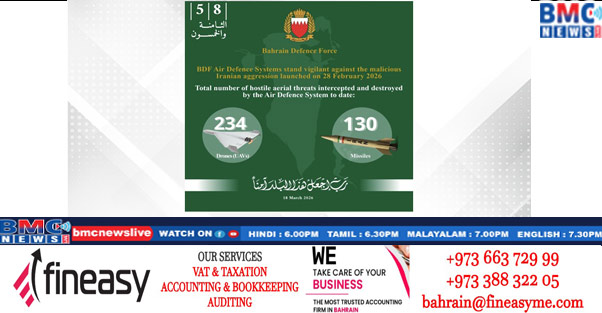 ബഹ്റൈനു നേരെ ഇറാൻ നടത്തുന്ന ആക്രമണത്തിന്റെ ഭാഗമായുള്ള മിസൈലുകളെയും ഡ്രോണുകളും , BDF ന്റെ വ്യോമ പ്രതിരോധ സംവിധാനങ്ങൾ വിജയകരമായി നേരിടുന്നുണ്ടെന്ന് ബഹ്റൈൻ പ്രതിരോധ സേനയുടെ ജനറൽ കമാൻഡ് അറിയിച്ചു. ഇതുവരെ ബഹ്റൈനെ ലക്ഷ്യമിട്ട് പതിച്ച 130 മിസൈലുകളും 234 ഡ്രോണുകളും നശിപ്പിച്ചതായും സേന വ്യക്തമാക്കി.BDF ഉദ്യോഗസ്ഥരുടെ സേവനത്തിലും നേതൃത്വത്തിലും ജനറൽ കമാൻഡ് അഭിമാനം പ്രകടിപ്പിക്കുകയും രാജ്യത്തെ പ്രതിരോധിക്കുന്നതിൽ അവരുടെ സുസ്ഥിരമായ പ്രവർത്തനത്തെ അഭിനന്ദിക്കുകയും ചെയ്തു.എല്ലാ പൊതുജനങ്ങളും അവരുടെ സ്വകാര്യ സുരക്ഷയ്ക്കായി പരമാവധി ജാഗ്രത പാലിക്കണമെന്ന് ജനറൽ കമാൻഡ് അഭ്യർത്ഥിച്ചു.