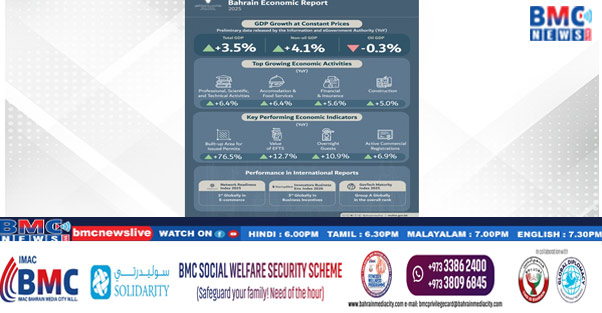 ഇൻഫർമേഷൻ ആൻഡ് ഇ-ഗവൺമെന്റ് അതോറിറ്റി പുറത്തിറക്കിയ പ്രാഥമിക ദേശീയ അക്കൗണ്ട്‌സ് ഡാറ്റ പ്രകാരം, 2025 ൽ സ്ഥിര വിലയിലുള്ള ബഹ്‌റൈന്റെ ജിഡിപി 3.5% വാർഷിക വളർച്ച കൈവരിച്ചു, എണ്ണ ഇതര പ്രവർത്തനങ്ങളിലെ 4.1% വളർച്ചയാണ് ഇതിന് കാരണം, അതേസമയം എണ്ണ പ്രവർത്തനങ്ങൾ 0.3% നേരിയ കുറവുണ്ടായി. നിലവിലെ വിലയിൽ, ജിഡിപി 3.7% വർദ്ധിച്ചു, എണ്ണ ഇതര പ്രവർത്തനങ്ങളിലെ 5.3% വളർച്ചയാണ് ഇതിന് കാരണം, ഇത് എണ്ണ മേഖലയിലെ 5.7% ഇടിവ് നികത്തി. 2025 ലെ നാലാം പാദത്തിൽ, സ്ഥിര വിലയിലുള്ള ജിഡിപി 4.6% വാർഷിക വളർച്ച കൈവരിച്ചു, എണ്ണ ഇതര പ്രവർത്തനങ്ങളിലെ 7.4% വർദ്ധനവ് ഇതിന് കാരണമായി, അതേസമയം എണ്ണ പ്രവർത്തനങ്ങൾ 12.3% ചുരുങ്ങി.