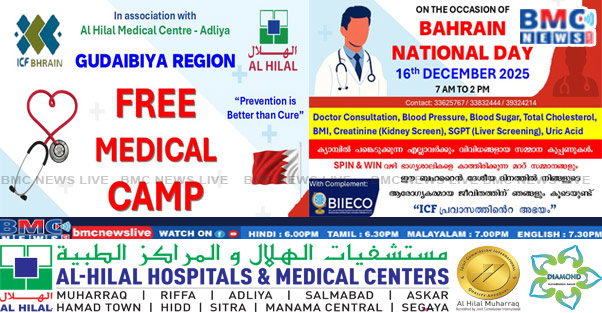 അമ്പത്തിനാലാമത് ബഹ്റൈൻ ദേശീയ ദിനത്തോടനുബന്ധിച്ച് ഐ സി എഫ് ഗുദൈബിയ റീജിയൻ അൽ ഹിലാൽ ഹോസ്പിറ്റലുമായി സഹകരിച്ച് ഡിസംബർ 16 (ചൊവ്വ) കാലത്ത് 7 മണി മുതൽ സൗജന്യ മെഡിക്കൽ ക്യാമ്പ് സംഘടിപ്പിക്കുന്നു.