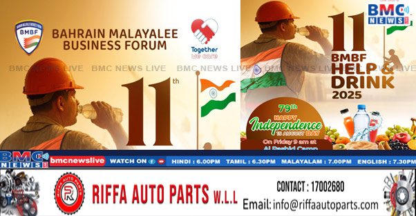 ബഹ്റൈൻ മലയാളി ബിസിനസ് ഫോറം 11ാം മത് ബി.എം. ബി.എഫ് ഹെൽപ്പ് & ഡ്രിങ് 2025 നീണ്ടുനിൽക്കുന്ന കർമ പദ്ധതിയിൽ ആഗസ്റ്റ് 15 വെള്ളിയാഴ്ച തൂബ്ലി അൽ റാഷിദ് തൊഴിൽ മേഖലയിൽ വിവിധ ആഘോഷങ്ങൾക്ക് തുടക്കമാവും.തൊഴിലാളികൾക്ക് സ്വാതന്ത്ര്യ ദിനത്തിൽ ഭക്ഷണത്തിനും പാനീയങ്ങൾക്കും പുറമെ ത്രിവർണ കളറിലുള്ള ഐസ്ക്രീം. എനർജി ഡ്രിംങ് വിവിധ സമ്മാനങ്ങൾ കൂടി തൊഴിലാളികൾക്കിടയിൽ വിതരണം ചെയ്യുന്നതാണ്.ബഹ്റൈനിൽ ബി.എം. ബി.എഫ് എന്ന സംഘടനയാണ് അത്യുഷ്ണ കാലത്ത് ആദ്യമായി തൊഴിലാളികൾക്കിടയിൽ ഇത്തരം പ്രവർത്തനങ്ങൾക്ക് തുടക്കമാവാനും ഇതര സംഘടനകൾ പിൽക്കാലത്ത് ഏറ്റെടുത്തതിലും ഈ കാലഘട്ടത്തിൽ ഏറെ അഭിമാനമുണ്ടെന്നും മലയാളി ബിസിനസ് ഫോറം ഭാരവാഹികളും വളണ്ടിയേർസ് ടീമും വാർത്താ കുറിപ്പിൽ അറിയിച്ചു.