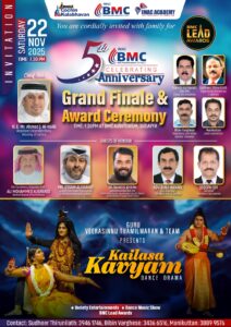 ബഹ്റൈൻ മീഡിയ സിറ്റിയുടെ അഞ്ചാം വാർഷികാഘോഷവും ശ്രാവണ മഹോത്സവം 2025 ഗ്രാൻഡ്ഫിനാലെയും, ബിഎംസി ലീഡ് അവാർഡ് ദാനച്ചടങ്ങും നവംബർ 22 ശനിയാഴ്ച വൈകിട്ട് നടക്കും. ഈ വർഷത്തെ ബി എം സി ലീഡ് ഹ്യൂമാനിറ്റേറിയൻ അവാർഡ് ഇന്ത്യൻ ലേഡീസ് അസോസിയേഷൻറെ സ്നേഹ റിക്രിയേഷൻ സെന്ററിന് സമർപ്പിക്കും