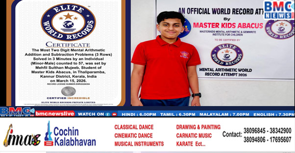 മാനസിക ഗണിതത്തിൽ (Mental Arithmetic) വിസ്മയിപ്പിക്കുന്ന പ്രകടനവുമായി പേരാമ്പ്ര ചെറുവണ്ണൂർ സ്വദേശി മെഹ്ഫിൽ മുജീബ് ലോകറെക്കോർഡ് പട്ടികയിൽ ഇടംപിടിച്ചു. എലൈറ്റ് വേൾഡ് റെക്കോർഡ്സ് (Elite World Records) സംഘടിപ്പിച്ച മത്സരത്തിലാണ് ഈ അപൂർവ്വ നേട്ടം കൈവരിച്ചത്.രണ്ട് അക്കങ്ങൾ വീതമുള്ള സങ്കലന-വ്യകലന (Addition and Subtraction) കണക്കുകൾ അതിവേഗത്തിൽ പരിഹരിച്ചാണ് മെഹ്ഫിൽ റെക്കോർഡ് കുറിച്ചത്. മൂന്ന് വരികളിലായുള്ള 57 സങ്കലന-വ്യകലന (Addition and Subtraction) പ്രശ്നങ്ങൾ വെറും മൂന്ന് മിനിറ്റിനുള്ളിൽ കൃത്യമായി പരിഹരിച്ചാണ് ഈ കൊച്ചു മിടുക്കൻ വിധികർത്താക്കളെ അമ്പരപ്പിച്ചത്. 2026 മാർച്ച് 15-നായിരുന്നു ഈ ചരിത്ര നേട്ടം.ബഹ്റൈൻ പ്രവാസിയായ മുജീബിന്റെയും മുഫീദ മുജീബിന്റെയും മൂത്ത മകനാണ് മെഹ്ഫിൽ. ബഹ്റൈൻ ഇന്ത്യൻ സ്കൂളിലെ ഏഴാം ക്ലാസ് വിദ്യാർത്ഥിയായ മെഹ്ഫിൽ, തളിപ്പറമ്പ് ‘മാസ്റ്റർ കിഡ്സ് അബാക്കസി’ലെ (Master Kids Abacus) വിദ്യാർത്ഥികൂടിയാണ്. സിന്ധു ടീച്ചർ, നാരായണൻകുട്ടി സർ, സജിത ടീച്ചർ എന്നിവരുടെ മികച്ച പരിശീലനമാണ് മെഹ്ഫിലിനെ ഈ ഉജ്ജ്വല നേട്ടത്തിലേക്ക് നയിച്ചത്. മുഫ്ലിഹ് സമാൻ മുജീബ് സഹോദരനാണ്.അഭിമാനകരമായ ഈ നേട്ടത്തെ തുടർന്ന് മെഹ്ഫിലിന് ബഹ്റൈനിലെ പ്രവാസി സമൂഹത്തിൽ നിന്നും നാട്ടിൽ നിന്നും അഭിനന്ദന പ്രവാഹമാണ് ലഭിച്ചുകൊണ്ടിരിക്കുന്നത്.