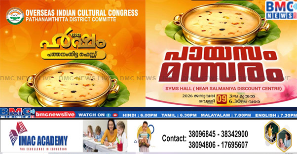 ഒ ഐ സി സി ബഹ്റൈൻ പത്തനംതിട്ട ജില്ലാ കമ്മിറ്റി ഫെബ്രുവരി 6 തീയതി ബഹ്റൈൻ കേരളീയ സമാജത്തിൽ നടത്തുന്ന പത്തനംതിട്ട ഫെസ്റ്റ് “ഹർഷം 2026″ ൻ്റെ ഭാഗമായി ഒ ഐ സി സി പത്തനംതിട്ട ജില്ലാ കമ്മിറ്റി വനിതാ വിംഗ് നടത്തുന്ന പായസ മൽസരം ജനുവരി 9 തീയതി വെള്ളിയാഴ്ച്ച വൈകിട്ട് 3 മണി മുതൽ സൽമാനിയായിൽ ഉള്ള സിംസ് ഹാളിൽ വെച്ച് ( സീറോ മലബാർ സോസൈറ്റി) നടക്കുമെന്ന് ഭാരവാഹികൾ അറിയിച്ചു. വിജയികൾക്കുള്ള സമ്മാനങ്ങൾ ബഹ്റൈൻ കേരളീയ സമാജത്തിൽ ഫെബ്രുവരി 6 ന് നടക്കുന്ന പത്തനംതിട്ട ഫെസ്റ്റ് ” ഹർഷം 2026″ ൻ്റെ സമാപന സമ്മേളനത്തിൽ വെച്ച് നൽകും .കൂടൂതൽ വിവരങ്ങൾക്ക് ശോഭ സജി( ജില്ലാ സെക്രട്ടറി ) 39038609 , സിജി തോമസ്സ് (ജില്ലാ അസ്സി :ട്രഷറർ )38219351 ,അജി . പി . ജോയ് 391562 83 ( ഇവൻ്റ് കോർഡിനേറ്റർ) എന്നിവരുമായി ബന്ധപ്പെടുക.
