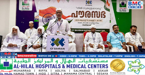 ഇന്ത്യൻ ഭരണഘടന വിഭാവനം ചെയ്യുന്ന തുല്യ നീതി പൗരൻമാരുടെ മൗലികാവകാശ മാണെന്നും, രാജ്യത്തിന്റെ പല ഭാഗങ്ങളിലും തുടർന്ന് കൊണ്ടിരിക്കുന്ന നീതി നിഷേധങ്ങളെ ഒറ്റക്കെട്ടായി ചെറുത്ത് തോൽപ്പിക്കണമെന്നും ഐ.സി.എഫ് ബഹ്റൈൻ സംഘടിപ്പിച്ച പൗരസഭ അഭിപ്രായപ്പെട്ടു. 79 – മത് സ്വാതന്ത്ര്യ ദിനാഘോഷങ്ങളുടെ ഭാഗമായാണ്’ നീതി സ്വതന്ത്രമാവട്ടെ ‘ എന്ന ശീർഷകത്തിൽ ഐ.സി.എഫ്. പൗരസഭ സംഘടിപ്പിച്ചത്.