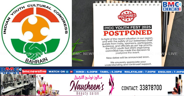 • ഐ.വൈ.സി.സി ബഹ്‌റൈൻ യൂത്ത് ഫെസ്റ്റ് 2025 മാറ്റിവെച്ചു.
