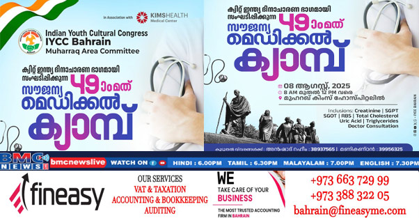 ഐ.വൈ.സി.സി ബഹ്റൈൻ നടത്തിവരുന്ന ആരോഗ്യ ബോധവൽക്കരണ ക്യാമ്പയിനിന്റെ തുടർച്ചയായി ഇന്ത്യൻ യൂത്ത് കൾച്ചറൽ കോൺഗ്രസ്, ( ഐ.വൈ.സി.സി ബഹ്റൈൻ ), മുഹറഖ് ഏരിയ കമ്മിറ്റിയും, കിംസ് മെഡിക്കൽ സെൻ്റർ മുഹറഖും ചേർന്ന് സൗജന്യ മെഡിക്കൽ ക്യാമ്പ് സംഘടിപ്പിക്കുന്നു. സംഘടനയുടെ ക്വിറ്റ് ഇന്ത്യാ ദിനാഘോഷങ്ങളുടെ ഭാഗമായാണ് 49-ാമത് സൗജന്യ മെഡിക്കൽ ക്യാമ്പ് നടക്കുന്നത്. 2025 ഓഗസ്റ്റ് 8 വെള്ളിയാഴ്ച രാവിലെ 8 മുതൽ ഉച്ചയ്ക്ക് 12 വരെ മുഹറഖിലെ കിംസ് ഹോസ്പിറ്റലിൽ വെച്ചാണ് ക്യാമ്പ് നടക്കുക.