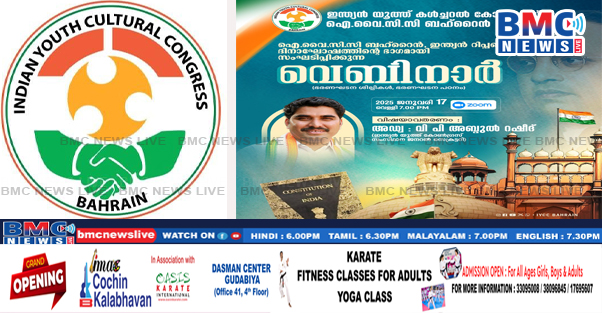 ഐ.വൈ.സി.സി ബഹ്റൈൻ റിപ്പബ്ലിക് ദിനാഘോഷത്തിന്റെ ഭാഗമായി വെബിനാർ സംഘടിപ്പിക്കുന്നു.ഭരണഘടന ശില്പികൾ ” ഭരണഘടന പഠനം ” എന്ന വിഷയത്തിൽ കെ പി സി സി അംഗവും, ഇന്ത്യൻ യൂത്ത് കോൺഗ്രസ് സംസ്ഥാന ജനറൽ സെക്രട്ടറിയുമായ അഡ്വ : വി പി അബ്ദുൽ റഷീദ് വിഷയാവതരണംനടത്തും.