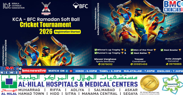 കെ സി എ – ബി എഫ് സി റമദാൻ സോഫ്റ്റ്ബോൾ ക്രിക്കറ്റ് ടൂർണമെൻറ് 2026 ഫെബ്രുവരി 26 മുതൽ ആരംഭിക്കും. സ്പോർട്സ് സെക്രട്ടറി നിക്സൺ വർഗീസ്, ടൂർണമെൻറ് കൺവീനർ ആൻറ്റൊ ജോസഫ്, ജോയിന്റ് കൺവീനർസ് ജോർജ് സെബാസ്റ്റ്യൻ, ജിതിൻ ജോസ്, ജോയൽ ജോസ്, ടീം കോർഡിനേറ്റർസ് യാസ്സർ, ഗ്രൗണ്ട് കോഓർഡിനേറ്റർസ് ജിൻസ് ജോസഫ്, ജോബി ജോർജ്, റോയ് ജോസഫ്, റോയ് സി ആന്റണി എന്നിവരുടെ നേതുത്വത്തിലുള്ള സംഘാടക സമിതിയാകും ടൂർണമെന്റ് നിയന്ത്രിക്കുക.സെഗ്യ്യയിലെ KCA ഗ്രൗണ്ടിൽ രാത്രി 7മണിമുതൽ ആണ് ടൂർണമെൻറ് സംഘടിപ്പിക്കുകയെന്നു ഭാരവാഹികൾ അറിയിച്ചു . 5 ഓവർ സോഫ്റ്റ്ബോൾ ക്രിക്കറ്റ് ടൂർണമെന്റിന്റെ രജിസ്ട്രേഷൻ ഫീസ് ഒരു ടീമിന് 25 /- ബിഡി ആണ്, ഓരോ ടീമിനും 6+3 കളിക്കാരെ രജിസ്റ്റർ ചെയ്യാം.വിജയികൾക്ക് 300 ഡോളർ ക്യാഷ് പ്രൈസും വിന്നേഴ്സ് ട്രോഫിയും രണ്ടാം സ്ഥാനക്കാർക്ക് 150 ഡോളർ ക്യാഷ് പ്രൈസും റണ്ണർ-അപ്പ് ട്രോഫിയും സമ്മാനിക്കും. കൂടാതെ മാൻ ഓഫ് ദി ഫൈനൽ മാച്ച്, ബെസ്റ്റ് ബൗളർ, ബെസ്റ്റ് ബാറ്റർ തുടങ്ങിയ വ്യക്തിഗത അവാർഡുകളും നൽകും.മുൻ വർഷങ്ങളിലെ പോലെ, ഈ ടൂർണമെൻ്റിൽ 20 ലധികം ടീമുകൾ പങ്കെടുക്കുമെന്ന് പ്രതീക്ഷിക്കുന്നുവെന്നു ഭാരവാഹികൾ പറഞ്ഞു ടീമുകളെ ഗ്രൂപ്പുകളായി തിരിച്ചു ലീഗ് അടിസ്ഥാനത്തിൽ ആയിരിക്കും മത്സരങ്ങൾ നടക്കുക.വിശദ വിവരങ്ങൾക്കും, രെജിസ്ട്രേഷനും ടൂർണമെൻറ് കൺവീനർ ആൻറ്റൊ ജോസഫ് (മൊബൈൽ: 39719888) , സ്പോർട്സ് സെക്രട്ടറി നിക്സൺ വർഗീസ് (മൊബൈൽ: 39790112) എന്നിവരുമായി ബന്ധപെടുക