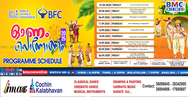 • കെസിഎ – ബി എഫ് സി ഓണം പൊന്നോണം 2025 ഓണാഘോഷം സംഘടിപ്പിക്കുന്നു