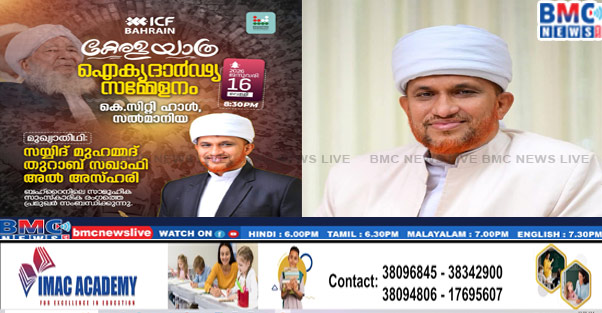സമസ്ത കേരള ജംഇയ്യത്തുൽ ഉലമ സെന്റിനറിയുടെ ഭാഗമായി കേരള മുസ്ലിം ജമാഅത്തിന്റെ നേതൃത്വത്തിൽ നടക്കുന്ന കേരള യാത്രയോടനുബന്ധിച്ച് ഐ.സി എഫ് ബഹ്റൈൻ സംഘടിപ്പിക്കുന്ന ഐക്യദാർഢ്യ സമ്മേളനം ജനുവരി 16 വെള്ളി രാത്രി എട്ടിന് സൽമാനിയ കെ. സിറ്റി ഹാളിൽ നടക്കും. കേരള മുസ്ലിം ജമാഅത്ത് സാരഥിയും മർകസ് ഉപാദ്ധ്യക്ഷനുമായ സയ്യിദ് മുഹമ്മദ് തുറാബ് സഖാഫി അൽ അസ്ഹരി സമ്മേളനത്തിൽ മുഖ്യാതിഥിയാവും.