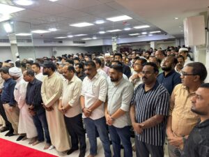 കഴിഞ്ഞ ദിവസം മരണപ്പെട്ട കെഎംസിസി ബഹ്റൈൻ പ്രസിഡന്റ് ഹബീബ് റഹ്മാന്റെ പത്നി യസീന ഹബീബിന് വേണ്ടിയുള്ള മയ്യിത്ത് നമസ്കാരവും പ്രത്യേക പ്രാർത്ഥനയും മനാമ സയ്യിദ് ഹൈദരലി ശിഹാബ് തങ്ങൾ ഓഡിറ്റോറിയത്തിൽ വെച്ചു നടന്നു. കെഎംസിസി ബഹ്റൈൻറെ നേതൃത്വത്തിൽ നടന്ന അനുശോചന സംഗമത്തിൽ ബഹ്റൈനിലെ സാമൂഹിക സാംസ്കാരിക മത രംഗത്തെ പ്രമുഖർ, കെഎംസിസി ബഹ്റൈൻ സംസ്ഥാന ജില്ലാ ഏരിയ മണ്ഡലം പഞ്ചായത്ത് നേതാക്കൾ, പ്രവർത്തകർ തുടങ്ങി സമൂഹത്തിലെ നാനാ തുറകളിലുമുള്ള നൂറുകണക്കിന് ആളുകൾ പങ്കെടുത്തു. മയ്യിത്ത് നമസ്കാരത്തിന് അബ്ദുൽ റസാഖ് നദ്വി നേതൃത്വം നൽകി. സയ്യിദ് യാസ്സർ ജിഫ്രി തങ്ങൾ പ്രത്യേകം പ്രാർത്ഥന നടത്തി.
