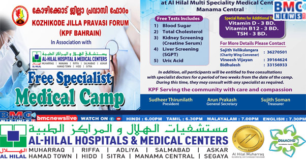 കോഴിക്കോട് ജില്ലാ പ്രവാസി ഫോറം (കെ.പി. എഫ് ) ബഹ്റൈൻ അൽ ഹിലാൽ മെഡിക്കൽ സെൻ്റർ മനാമയുമായി ചേർന്ന് മെഡിക്കൽ ക്യാമ്പ് സംഘടിപ്പിക്കുന്നു.2026 ഫെബ്രുവരി 13 വെള്ളിയാഴ്ച രാവിലെ 7.30 മുതൽ ഉച്ചക്ക് 12 മണി വരെ മനാമ ബസ്സ് സ്റ്റേഷന് സമീപമുള്ള അൽ ഹിലാൽ മെഡിക്കൽ സെൻ്ററിൽ വെച്ച് നടത്തുന്ന മെഡിക്കൽ ക്യാമ്പിൽ യൂറിക് ആസിഡ്, സെറം ക്രിയാറ്റിൻ (കിഡ്നി സ്ക്രീനിംഗ് ), ട്രൈ ഗ്ലിസറൈഡ്, ബ്ലഡ് ഷുഗർ, കൊളസ്ട്രോൾ, എസ് ജി. പി.ടി (ലിവർ സ്ക്രീനിംഗ് ) എന്നിവയടങ്ങുന്ന രക്ത പരിശോധനയും ഡോക്ടറുടെ സേവനവും സൗജന്യമായി ലഭിക്കുമെന്ന് പ്രസിഡണ്ട് സുധീർ തിരുന്നിലത്ത്, ജനറൽ സെക്രട്ടറി അരുൺ പ്രകാശ്, ട്രഷറർ സുജിത്ത് സോമൻ എന്നിവർ പത്രക്കുറിപ്പിലൂടെ അറിയിച്ചു. പ്രസ്തുത മെഡിക്കൽ ക്യാമ്പിൽ പങ്കെടുക്കാൻ താല്പര്യമുള്ളവർ മുൻ കൂട്ടി താഴെ കാണുന്ന നമ്പരുകളിൽ വിളിച്ചോ വാട്സപ്പിൽ മെസ്സേജ് അയച്ചോ പേര് രജിസ്റ്റർ ചെയ്യണമെന്ന് ചാരിറ്റി വിംഗ് കൺവീനർ സജിത്ത് വെള്ളികുളങ്ങര അറിയിച്ചു. കൂടുതൽ വിവരങ്ങൾക്ക് ബന്ധപ്പെടുക 36270501,39164624,33156933.