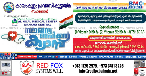 സ്വാതന്ത്ര്യദിനാഘോഷത്തിന്റെ ഭാഗമായി അൽ ഹിലാൽ മെഡിക്കൽ സെൻ്റർ മനാമയുമായി സഹകരിച്ചു കൊണ്ട് കായംകുളം പ്രവാസി കൂട്ടായ്മ സൗജന്യ മെഡിക്കൽ ക്യാമ്പ് നടത്തുന്നു. ആഗസ്റ്റ് 15 വെള്ളിയാഴ്ച രാവിലെ 8 മുതൽ ഉച്ചക്ക് 12.30 വരെ അൽ ഹിലാൽ മെഡിക്കൽ സെൻ്റർ മനാമയിൽ വെച്ചാണ് സൗജന്യ മെഡിക്കൽ ക്യാമ്പ് നടക്കുന്നത്.
