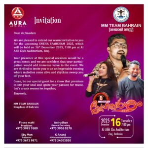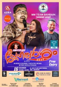 ബഹ്‌റൈനിലെ ജീവകാരുണ്യ പ്രവർത്തന രംഗത്തെ സജീവ സാന്നിധ്യമായ എം എം ടീം ബഹ്‌റൈൻ മലയാളി മനസ്സ് ഓറ ആർട്സിന്റെ ബാനറിൽ ബഹ്‌റൈൻ നാഷണൽഡേയോട് അനുബന്ധിച്ച് സംഘടനയുടെ എട്ടാമത് വാർഷികആഘോഷം സംഘടിപ്പിക്കുന്നു.