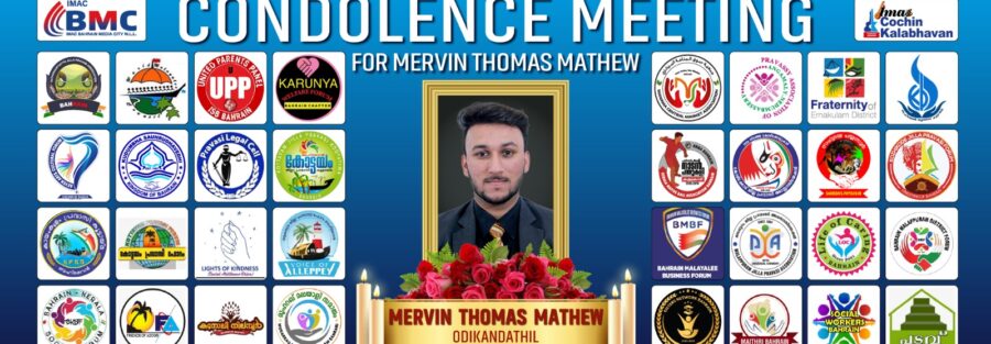 ബഹ്റൈനിലെ പ്രമുഖ സാമൂഹിക പ്രവർത്തകനായ മോനി ഒടിക്കണ്ടത്തിലിന്റെ മകൻ മർവിൻ തോമസ് മാത്യു വിന്റെ അകാല വിയോഗത്തിൽ ബഹ്റൈൻ മിഡിയ സിറ്റിയിൽ വെച്ച് അനുശോചന യോഗം സംഘടിപ്പിച്ചു. ഐമാക് ബഹ്റൈൻ മിഡിയ സിറ്റിയുടെ ചെയർമാനും മാനേജിങ് ഡയറക്ടറുമായ ഫ്രാൻസിസ് കൈതാരത്ത് അനുശോചന പ്രമയം അവതരിപ്പിച്ച് സംസാരിച്ചു.