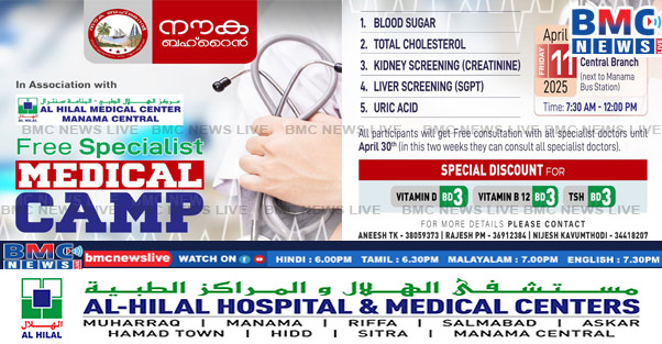 നൗക ബഹ്റൈൻ 2025 ഏപ്രിൽ 11 വെള്ളിയാഴ്ച അൽ ഹിലാൽ ഹോസ്പിറ്റൽ മനാമ സെന്റർ ബ്രാഞ്ചു മായി ( മനാമ ബസ് സ്റ്റാന്റിന് സമീപം ഉള്ള) സഹകരിച്ച് രാവിലെ 7:30 മുതൽ മെഗാ മെഡിക്കൽ ക്യാമ്പ് സംഘടിപ്പിക്കുന്നു.എല്ലാവരും പ്രസ്തുത ക്യാമ്പിൽ പങ്കെടുക്കുമെന്ന് ഭാരവാഹികൾ അറിയിച്ചു.പങ്കെടുക്കുവാനും,കൂടുതൽ വിവരങ്ങൾക്കും അനീഷ്. ടി കെ 38059373, അശ്വതി മിഥുൻ 32119436 എന്നീ നമ്പറുകളിൽ ബന്ധപ്പെടാം.