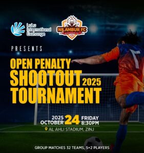 കനോലി നിലമ്പൂർ ബഹ്റൈൻ കൂട്ടായ്മയുടെ ഫുട്ബോൾ ടീമായ നിലമ്പൂർ എഫ് സി ലുലു മണി എക്സ്ചേഞ്ച്മായി സഹകരിച്ചുകൊണ്ട് പെനാൽറ്റി ഷൂട്ട് ഔട്ട് ടൂർണമെന്റ് സിഞ്ജ് അൽ അഹ്ലി സ്റ്റേഡിയം ഗ്രൗണ്ടിൽ വെള്ളിയാഴ്ച വൈകീട്ട് 8 മണിക്ക് നടത്തപ്പെടുന്നു.