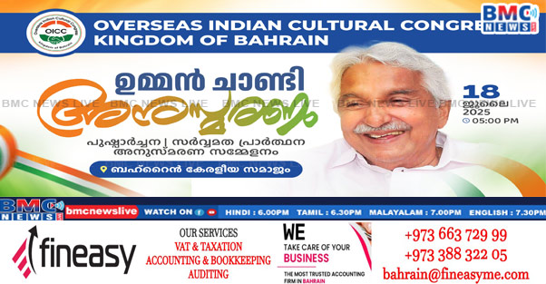 • ഒഐസിസി – ഉമ്മൻ ചാണ്ടി അനുസ്മരണം നാളെ (18/07/2025, വെള്ളിയാഴ്ച)- ബഹ്‌റൈൻ കേരളീയ സമാജത്തിൽ