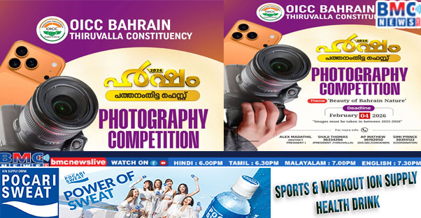 ഒഐസിസി പത്തനംതിട്ട ജില്ലാ കമ്മറ്റിയുടെ ആഭിമുഖ്യത്തിൽ ഫെബ്രുവരി 6 ന് ബഹ്റൈൻ കേരളീയ സമാജത്തിൽ വച്ച് നടത്തുന്ന ഹർഷം- 2026 ന്റെ പ്രചരണാർത്ഥം ഒഐസിസി തിരുവല്ല നിയോജകമണ്ഡലം കമ്മറ്റിയുടെ ആഭിമുഖ്യത്തിൽ നടത്തുന്ന ഫോട്ടോഗ്രാഫി മത്സരം ഫെബ്രുവരി നാലിന് അവസാനിക്കുമെന്ന് സംഘാടക സമതി അറിയിച്ചു. ബഹ്റൈന് പ്രകൃതി നൽകിയ സൗന്ദര്യം എന്ന വിഷയത്തെ ആസ്പദമാക്കി നടത്തുന്ന മത്സരത്തിൽ പങ്കെടുത്തു വിജയിക്കുന്ന ആളുകൾക്ക് ഹർഷം 2026 ന്റെ സമാപന സമ്മേളനത്തിൽ വച്ച് സമ്മാനങ്ങൾ നൽകുന്നതാണ് എന്ന് ഹർഷം 2026 ന്റെ ചെയർമാൻ സൈദ് എം എസ്, ജനറൽ കൺവീനർ ജീസൺ ജോർജ്, ജില്ലാ പ്രസിഡന്റ് അലക്സ് മഠത്തിൽ എന്നിവർ അറിയിച്ചു. കൂടുതൽ വിവരങ്ങൾക്ക് ഒഐസിസി തിരുവല്ല നിയോജകമണ്ഡലം കമ്മറ്റി പ്രസിഡന്റ് ഷാജി തോമസ് ( 36334296) ഫോട്ടോഗ്രഫി മത്സര കമ്മറ്റി കൺവീനർമാരായ എ പി മാത്യു ( 36192950) സിമി പ്രിൻസ് ( 38355122) എന്നീ നമ്പറുകളിൽ അറിയുവാൻ സാധിക്കും എന്ന് സംഘാടകർ അറിയിച്ചു.