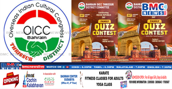 ഒഐസിസി ബഹ്റൈൻ തൃശൂർ ജില്ല കമ്മിറ്റി തുടർച്ചയായി രണ്ടാംവർഷവും ഇന്ത്യയുടെ റിപ്പബ്ലിക് ദിനം വിപുലമായ പരിപാടികളോടെ ആഘോഷിക്കുകയാണ്.ഇതിന്റെ ഭാഗമായി ഇന്ത്യാ ചരിത്രത്തെ ആസ്പദമാക്കി ജനുവരി 31 ന് സിംസ് ഗുഡ്വിൻ ഹാളിൽ വെച്ച് ഫാമിലി ക്വിസ് മത്സരം സംഘടിപ്പിക്കുന്നു.തുടർന്ന് നടക്കുന്ന പൊതുസമ്മേളനത്തിൽ വെച്ച് വിജയികൾക്കുള്ള സമ്മാനദാനം നൽകും.ജനതയിൽ ഇന്ത്യയുടെ ചരിത്രാവബോധം വളർത്തുകയെന്ന ലക്ഷ്യത്തോടെ നടത്തപ്പെടുന്ന ക്വിസ് മത്സരം ബഹ്റൈനിലെ പ്രമുഖ ക്വിസ് മാസ്റ്റർ അനീഷ് നിർമലൻ നിയന്ത്രിക്കും.