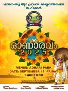 ബഹ്റൈനിലെ പത്തനംതിട്ട ജില്ലാക്കാരുടെ പ്രവാസി കൂട്ടായ്മയായ പത്തനംതിട്ട ജില്ലാ പ്രവാസി അസോസിയേഷൻ ഈ വർഷത്തെ ഓണാഘോഷ പരിപാടിയായ “ഓണാരവം 2025” ൻ്റെ പോസ്റ്റർ പ്രകാശനം ചെയ്തു.