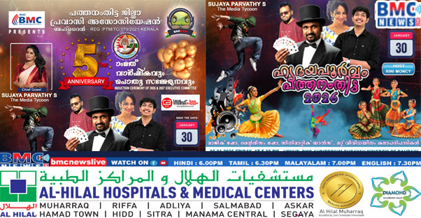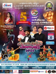 പത്തനംതിട്ട ജില്ലാ പ്രവാസി അസോസിയേഷൻ ബഹറിന്റെ അഞ്ചാമത് വാർഷികവും 2026-27 വർഷത്തെ കമ്മിറ്റിയുടെ സ്ഥാനാരോഹണവും ഹൃദയപൂർവ്വം പത്തനംതിട്ട എന്ന പേരിൽ നാളെ വെള്ളിയാഴ്ച (30-01-2026) വൈകിട്ട് ആറുമണി മുതൽ സെഗയ ബിഎംസി ഹാളിൽ വച്ച് നടത്തപ്പെടുന്നതാണ്.