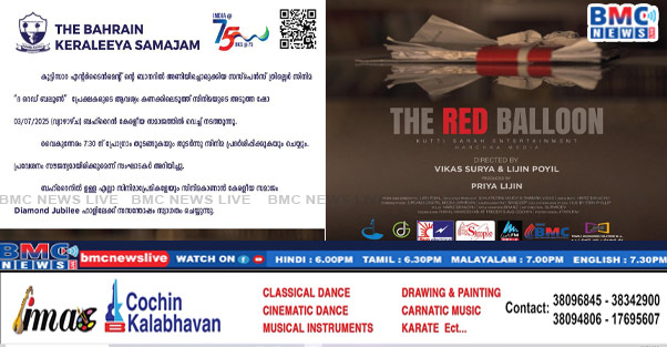 കുട്ടിസാറ എന്റർടൈൻമെന്റ് ന്റെ ബാനറിൽ അണിയിച്ചൊരുക്കിയ സസ്പെൻസ് ത്രില്ലെർ സിനിമ “ദ റെഡ് ബലൂൺ”പ്രേക്ഷകരുടെ ആവശ്യം കണക്കിലെടുത്ത് സിനിമയുടെ അടുത്ത ഷോ 03/07/2025 (വ്യാഴാഴ്ച) ബഹ്റൈൻ കേരളീയ സമാജത്തിൽ വെച്ച് നടത്തുന്നു.വൈകുന്നേരം 07:30 ന് പ്രോഗ്രാം തുടങ്ങുകയും തുടർന്നു സിനിമ പ്രദർശിപ്പിക്കുകയും ചെയ്യും. പ്രവേശനം സൗജന്യമായിരിക്കുമെന്ന് സംഘാടകർ അറിയിച്ചു.ബഹ്റൈനിൽ ഉള്ള എല്ലാ സിനിമാപ്രേമികളേയും സിനിമകാണാൻ കേരളീയ സമാജം Diamond Jubilee ഹാളിലേക്ക് സസന്തോഷം സ്വാഗതം ചെയ്യുന്നു.