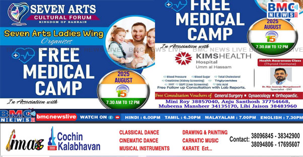 സെവൻ ആർട്സ് കൾച്ചറൽ ഫോറം ലേഡീസ് വിങ്ങിന്റെ ആഭിമുഖ്യത്തിൽ കിംസ് ഹെൽത്ത് ഹോസ്പിറ്റലുമായി (Umm Al Hassam) സഹകരിച്ച് 2025 ഓഗസ്റ്റ് 15 ന് വെള്ളിയാഴ്ച രാവിലെ 7.30 മുതൽ 12 മണി വരെ മെഡിക്കൽ ക്യാമ്പും ഇന്ത്യൻ സ്വാതന്ത്ര്യ ദിന ആഘോഷവും സംഘടിപ്പിക്കുന്നു. മെഡിക്കൽ ക്യാമ്പിനോട് അനുബന്ധിച്ച് തൈറോയ്ഡ് രോഗവും ചികിത്സ രീതികളും വിഷയത്തിൽ Dr.റിജോ ജയരാജ്‌ മംഗലശ്ശേരിയിലിന്റെ ചർച്ച ക്ലാസും മറ്റു വിവിധ പരിപാടികളും ഉണ്ടായിരിക്കുന്നതാണ് മെഡിക്കൽ ക്യാമ്പിൽ പങ്കെടുക്കുന്നവർക്ക് ആവശ്യമെങ്കിൽ വിദഗ്ധ ഡോക്ടർമാരുടെ ഫ്രീ കൺസൾട്ടേഷനും നൽകപ്പെടുന്നതാണ് പങ്കെടുക്കുവാൻ ആഗ്രഹിക്കുന്നവർ താഴെപ്പറയുന്ന നമ്പരുകളിൽ മിനി മാത്യു (38857040) അഞ്ചു സന്തോഷ് (37754668) മുബിന മൻഷീർ (34135170) Dr.അഞ്ജന വിനീഷ് (33480516)