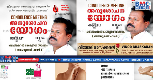 ബ്ലഡ് ഡോണേഴ്സ് കേരള (ബിഡികെ) സ്ഥാപകനും, സംസ്ഥാന പ്രസിഡണ്ടും, പ്രമുഖ സാമൂഹിക പ്രവർത്തകനുമായിരുന്ന വിനോദ് ഭാസ്ക്കറിന്റെ അകാല നിര്യാണത്തിൽ അനുശോചനം രേഖപ്പെടുത്തുന്നതിനായി ബിഡികെ ബഹ്‌റൈൻ ചാപ്റ്റർ സംഘടിപ്പിക്കുന്ന അനുശോചന യോഗം ജൂലൈ 21 തിങ്കളാഴ്ച രാത്രി 8 മണിക്ക് ബഹ്‌റൈൻ കേരളീയ സമാജത്തിൽ നടക്കുമെന്ന് ഭാരവാഹികൾ അറിയിച്ചു.