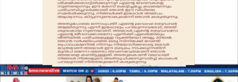 അതുപോലെ ഒന്നാംപ്രതി എന്റെ personal ഡ്രൈവർ ആയിരുന്നു എന്ന് ഇപ്പോഴും പറയുന്നവരോട്, അത് ശുദ്ധമായ നുണയാണ്. അയാൾ എന്റെ ഡ്രൈവറോ എന്റെ ജീവനക്കാരനോ എനിക്ക് ഏതെങ്കിലും രീതിയിൽ പരിചയമുള്ള വ്യക്തിയോ അല്ല, 2016ൽ ഞാൻ വർക്ക്ചെയ്ത ഒരു സിനിമക്ക് വേണ്ടി പ്രൊഡക്ഷനിൽ നിന്നും നിയോഗിക്കപ്പെട്ട ഒരാൾ മാത്രമാണ് അയാൾ ഈ ക്രൈം നടക്കുന്നതിന് മുൻപ് ഒന്നോ രണ്ടോ തവണമാത്രമാണ് ഞാൻ അയാളെ കണ്ടിട്ടുള്ളത്. അതുകൊണ്ട് ദയവായി നിങ്ങൾ നിങ്ങളുടെ അഭിരുചിക്കനുസരിച്ച് കഥകൾ പറയുന്നത് നിർത്തുമെന്ന് കരുതുന്നു.