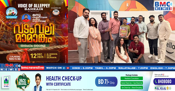 വോയ്സ് ഓഫ് ആലപ്പി സ്പോർസ് വിങ്ങിന്റെ നേതൃത്വത്തിൽ വടം വലി മത്സരം സംഘടിപ്പിക്കുന്നു. ഡിസംബർ 12 ന് വെള്ളിയാഴ്ച തരംഗ ശൈലിയിലാണ് മത്സരം. സൽമാനിയയിലെ അൽ ഖുദിസിയാ ക്ലബ്ബിൽ വച്ച് സംഘടിപ്പിക്കുന്ന മത്സരത്തിൽ ബഹ്റൈനിലെ പ്രമുഖ ടീമുകൾ പങ്കെടുക്കും. നാല് മാസം മുമ്പ് മരണപ്പെട്ട വോയ്സ് ഓഫ് ആലപ്പി വടം വലി ടീം അംഗമായിരുന്ന മനു കെ രാജന്റെ സ്മരണയ്ക്കായാണ് ഈ മത്സരം. വിജയികൾക്ക് മനു മെമ്മോറിയൽ ട്രോഫിയും മറ്റ് സമ്മാനങ്ങളും ലഭിക്കും. ടഗ് ഓഫ് വാർ അസോസിയേഷനുമായി സഹകരിച്ചാണ് ടൂർണമെൻറ് സംഘടിപ്പിക്കുന്നത്.